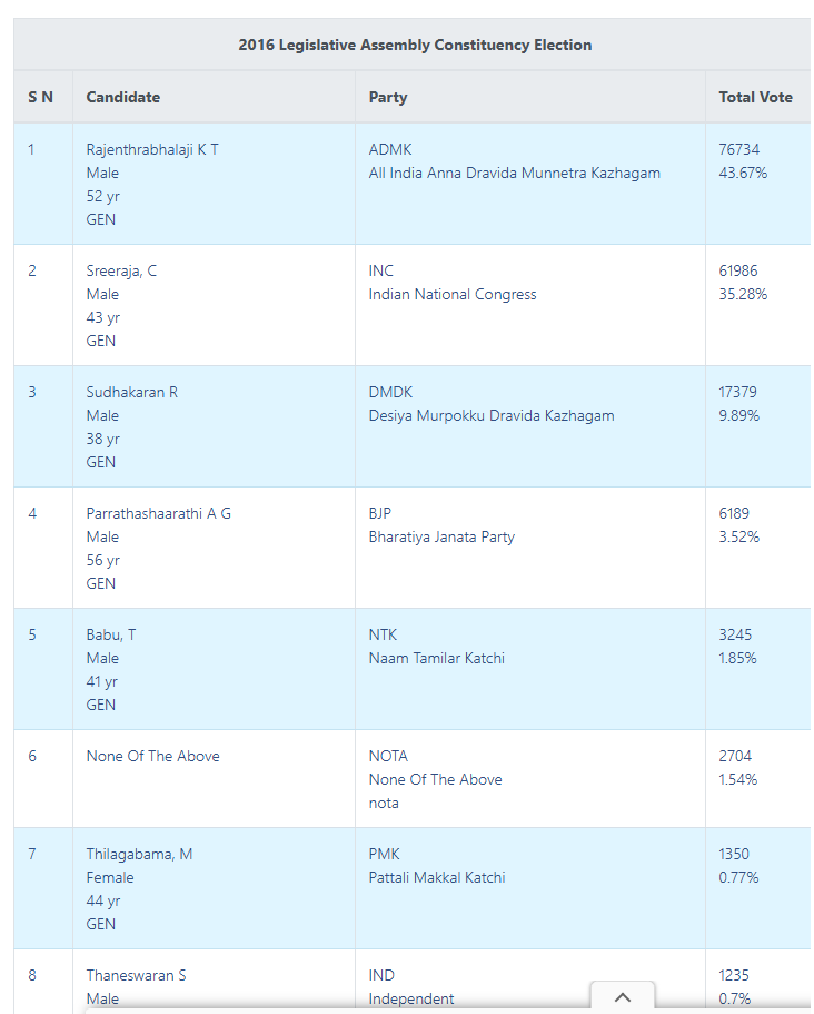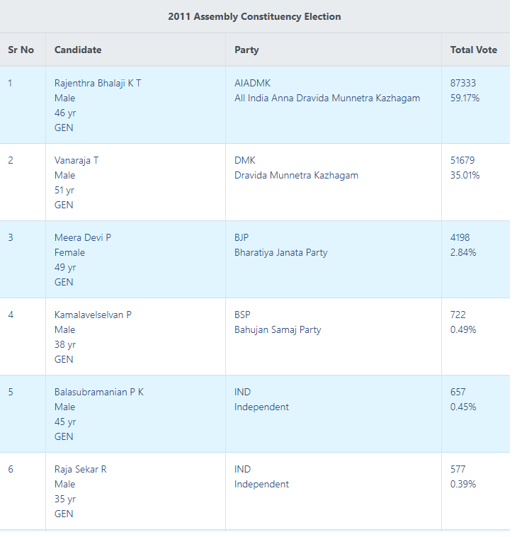 அவர் அனைத்திந்திய அண்ணா திராவிட முன்னேற்றக் கழகக் கட்சியைப் பிரதிநிதித்துவப்படுத்தினார்.