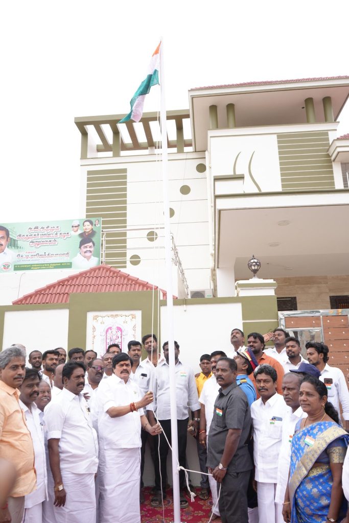 இந்திய குடியரசு தினத்தையொட்டி சிவகாசி அருகே திருத்தங்கல் பாலாஜி நகரில் உள்ள அதிமுக கட்சி அலுவலகத்தில் முன்னாள் அமைச்சர் கே.டி.ராஜேந்திரபாலாஜி தேசியக்கொடி ஏற்றி பொது மக்களுக்கு இனிப்புகள் வழங்கினார்
