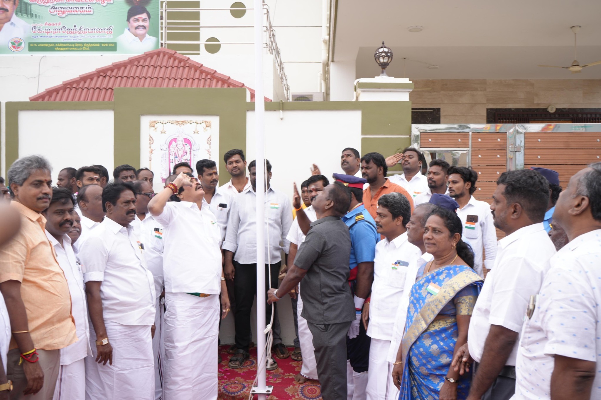 இந்திய குடியரசு தினத்தையொட்டி சிவகாசி அருகே திருத்தங்கல் பாலாஜி நகரில் உள்ள அதிமுக கட்சி அலுவலகத்தில் முன்னாள் அமைச்சர் கே.டி.ராஜேந்திரபாலாஜி தேசியக்கொடி ஏற்றி பொது மக்களுக்கு இனிப்புகள் வழங்கினார்
